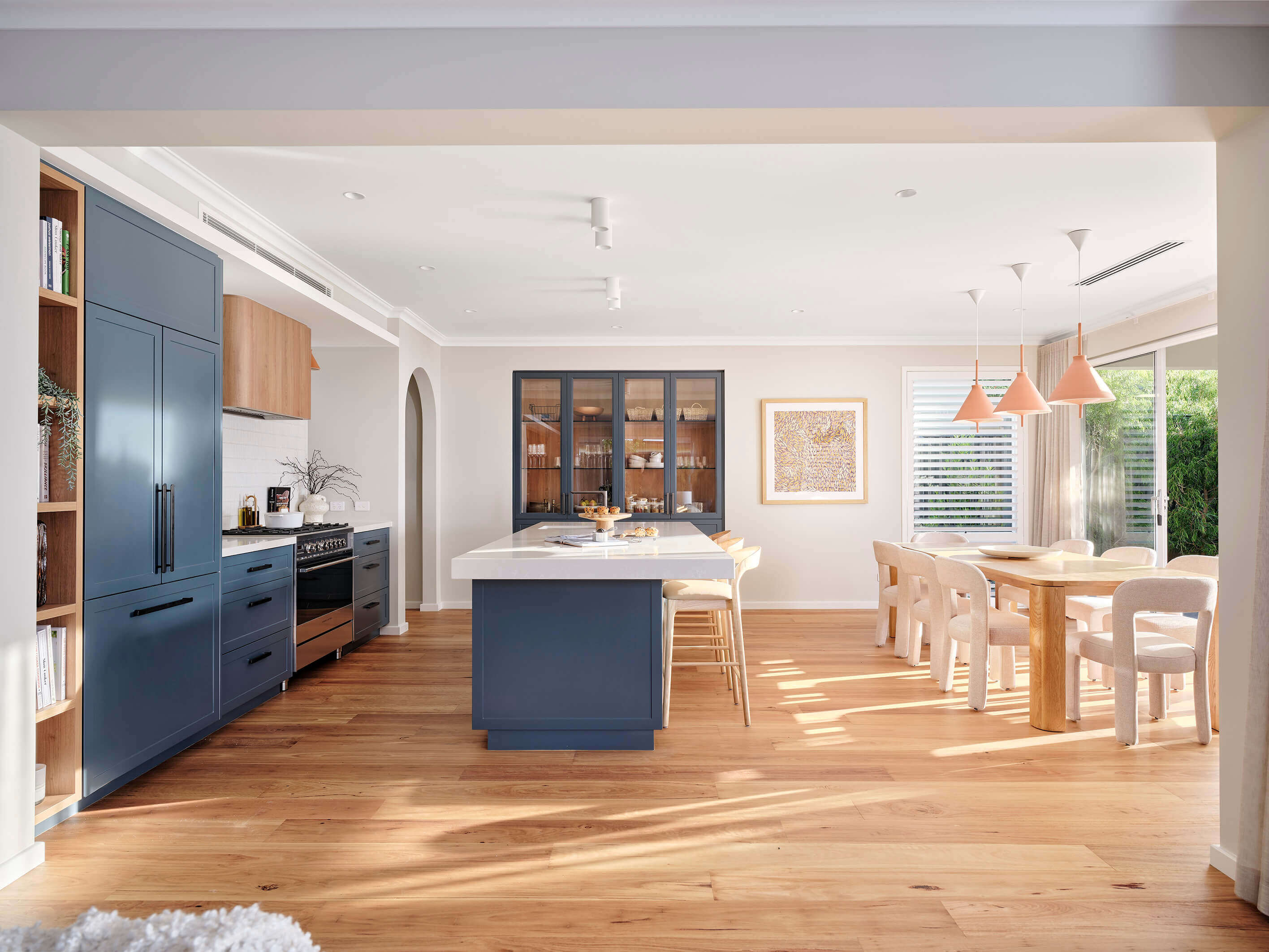 Our cabinetry selection for this kitchen is Polytec Habitat Smooth, which is fast becoming one of our clients’ most popular colour choices in 2025 because of its luxury mid-tone teal blue and sleek flat surface. The contrasting wooden cabinetry is Polytec Tasmanian Oak, and the cabinetry style throughout this kitchen is Polytec Hamptons’ profile from their thermolaminated range.