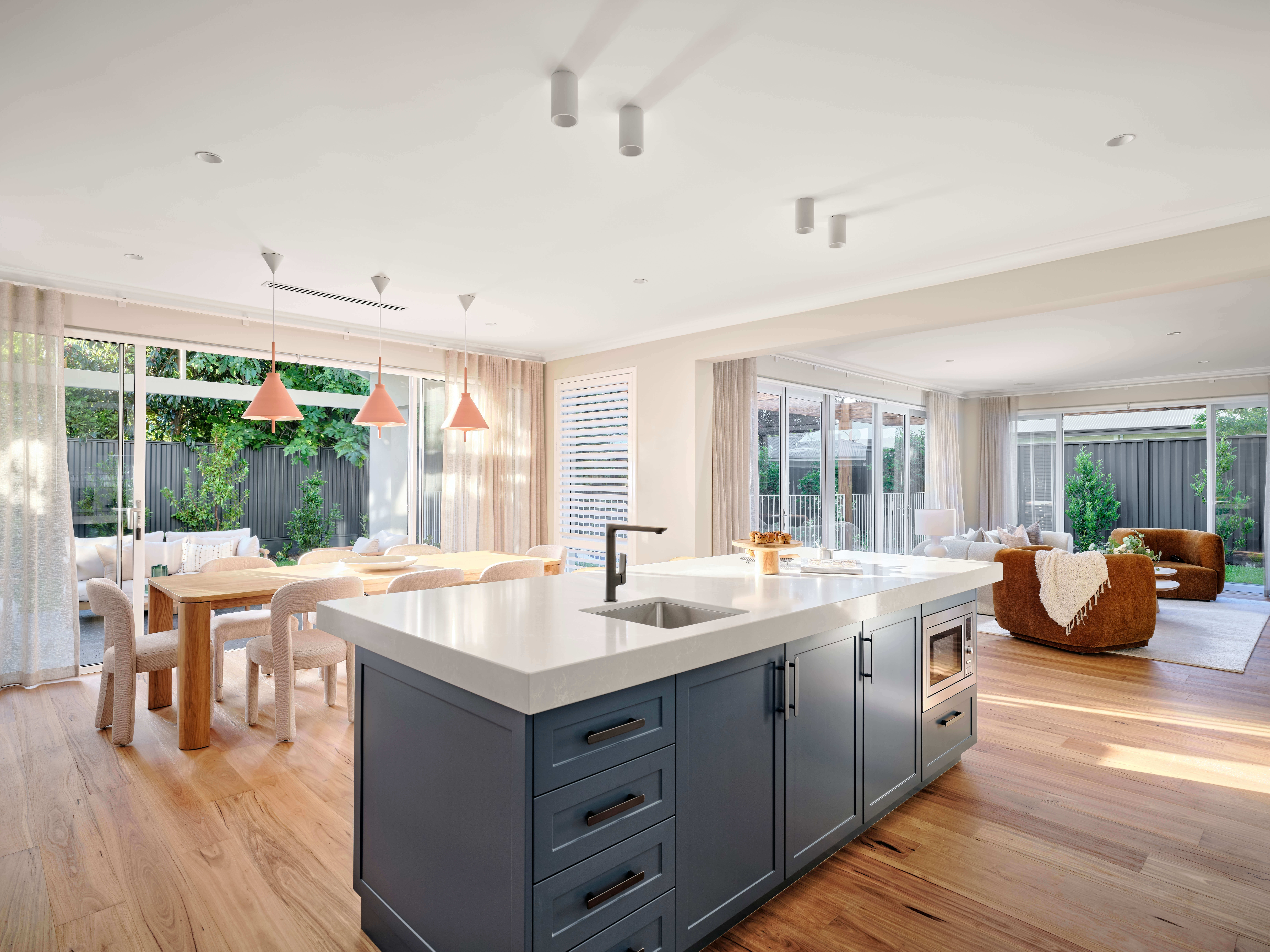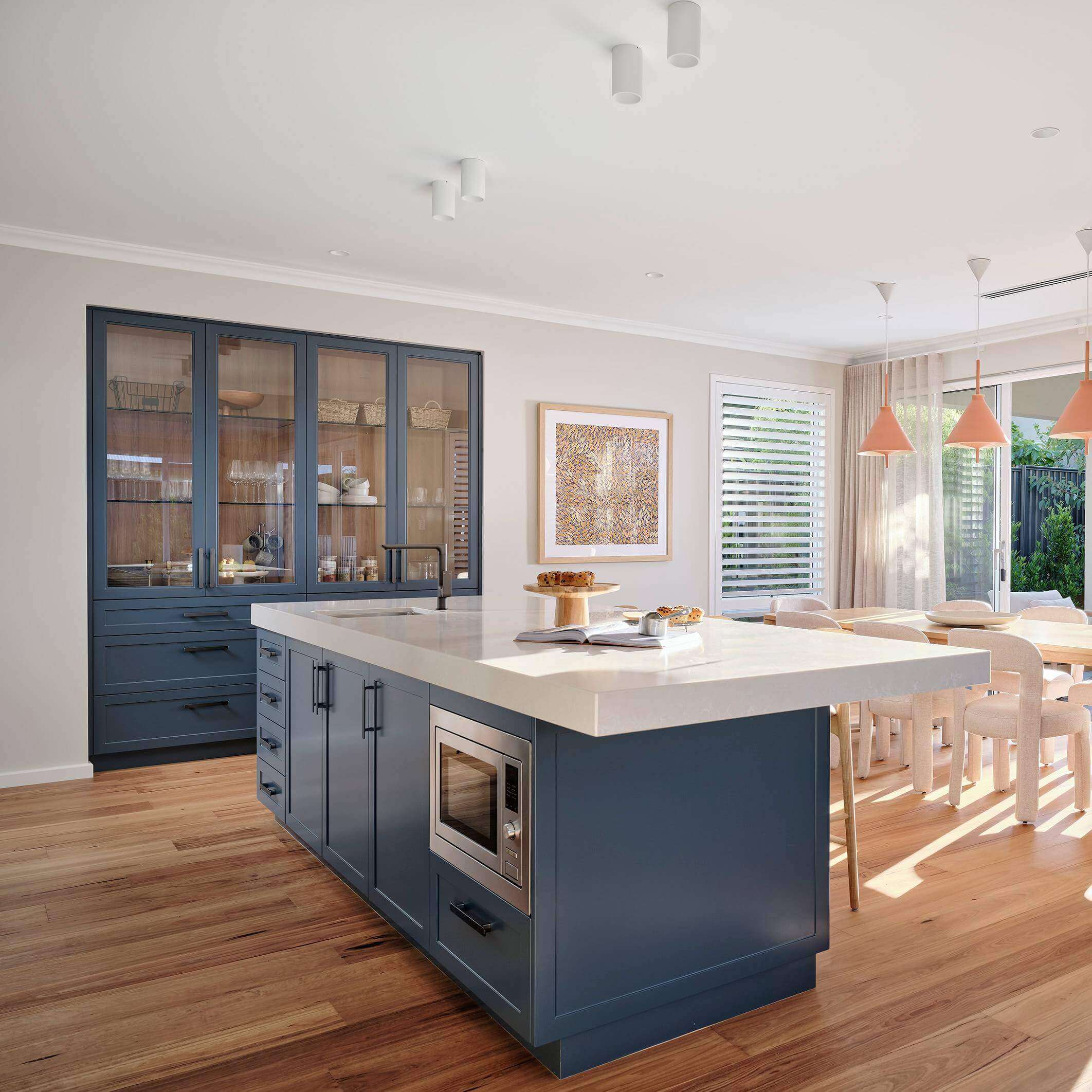 The design style we’ve used in this kitchen is what we define as Modern Shaker. It’s a contemporary interpretation of the traditional Hamptons style kitchen, where shaker cabinetry creates clean lines and minimal layering. In Modern Shaker kitchens, you can embrace colour and contemporary design trends and even combine them with flat panel cabinetry if it suits your design style.